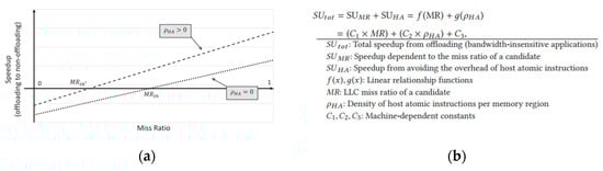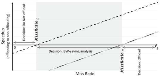 DCC architectures provide excellent opportunities for improving performance by saving memory bandwidth, avoiding cache pollution, exploiting memory level parallelism, and using special purpose accelerators. Management policies are designed to take advantage of these according to the specific DCC design and workload. For example, locality-aware instruction offloading [,,,,,] involves an analysis of the cache behavior of a set of instructions in an application. This analysis is based on spatial locality (memory locations are more likely to be accessed if neighboring memory locations have been recently accessed) and temporal locality (memory locations are more likely to be accessed if recently accessed). If a section of a code’s memory access pattern is found to exhibit little spatial and temporal locality, then these instructions are considered a good candidate for offloading to a memory PE. The specific method to assess locality varies across different implementations. Commonly applied methods include cache profiling [,,], code analysis [,,,,], hardware cache-hit counters [], and heuristic or machine learning techniques [,,,,,,].