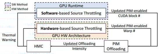 - Nai, L.; Hadidi, R.; Xiao, H.; Kim, H.; Sim, J.; Kim, H. CoolPIM: Thermal-aware source throttling for efficient PIM instruction offloading. In Proceedings of the IEEE International Parallel and Distributed Processing Symposium (IPDPS), Vancouver, BC, Canada, 21–25 May 2018; pp. 680–689. [Google Scholar] [CrossRef]