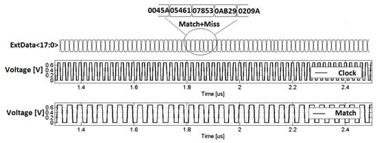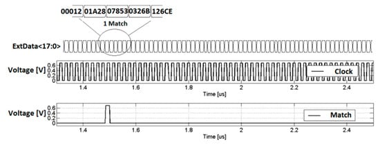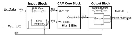 The Input Block stage contains 18 input buffers and a Serial-Input-Parallel-Output (SIPO) synchronous register. This stage, as well as the entire CAM, operates in two different modes: WRITE and SEARCH. Every 18-bit digital word that must be stored (or searched) inside the memory is provided by the ExtData bus signal (generated from an external setup). An external Write Enable signal (WE_Ext) asserts the CAM operation mode. In the case of the WRITE mode, this signal feeds the input of the SIPO register, which, in turn, provides the Write Enable signals (WE<63:0>) for each CAM row. In this way, 64 18-bit data, coming from the ExtData bus, are correctly stored inside the 64 rows of the CAM, once every clock cycle. In order to correctly operate, ExtData must be synchronous with the SIPO clock: ExtData changes every clock rising edge and at the same time, the WE signal shifts to the following memory row. Lastly, before reaching the CAM memory bank and being stored, digital words from ExtData are buffered into the Search Lines (SL<17:0>) bus, and are the same for storage or search operations. Driving the data lines is a power-hungry operation and, for this reason, these buffers’ power consumption must be taken into account for complete device characterization.