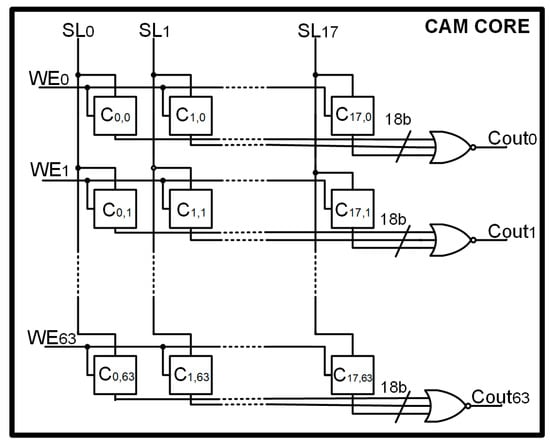 The CAM-28CB Core stores 64 digital words (j = 0–63) of 18-bit (i = 0–17). Each one of the 18 single-bit cells in the j-th row is connected to an NOR gate, whose output (Coutj) feeds the final encoder located in the Output Block. Figure 2 illustrates a schematic view of the Core Block. Each cell located in the j-th row shares the same WE signal, in order to store every bit of a digital word in the same clock cycle during the WRITE phase.