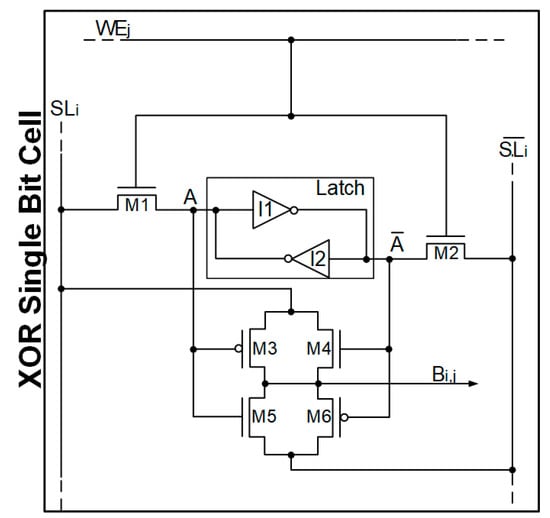 The single-bit cell is able to store a single bit, while, during the SEARCH phase, it performs an XOR logic operation. A schematic of the single-bit cell is shown in Figure 3. It is composed of a latch (cross coupled inverters), which stores the bit, two Metal-Oxide-Semiconductor (MOS) transistors (M1 and M2) used as switches, and four MOS transistors (M3, M4, M5, and M6) performing the XOR operation between searched data (coming from the SL bus) and stored data.