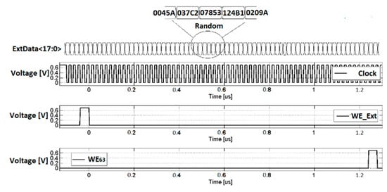 After the WRITE mode operation is concluded, the ExtData bus starts to switch as a function of the selected pattern. The input (WE_Ext) and output (WE63) signals of the SIPO register in write mode are also shown in Figure 5, in order to assert the start and end of the WRITE phase. The clock frequency in this case is set to 100 MHz. The power consumption of the prototype has been measured, cyclically repeating these patterns and also spreading the supply voltage and clock frequency. The power () is mainly dynamic and can be in first approximation expressed as a function of the total number of bits of the memory (Nbit,i), switching at frequency fCLK,i (usually different bit switches at different frequencies) and the equivalent capacitance (Cbit) per bit, according to Equation (7):