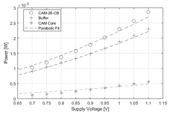where Nbit,eq is the equivalent number of bits switching at clock frequency (fCLK) and is equal to 378.15, which is a much lower value than the overall number of bits (1152), as expected. The vs. VDD at a 100 MHz clock frequency has been plotted in Figure 9, fitting with the parabolic behavior vs. VDD presented in Equation (7). Figure 10 shows the vs. clock frequency at a 0.85 V supply voltage and compares the measurement results with the linear fitting vs. fCLK derived from Equation (4). In both Figure 9 and Figure 10, the power has been divided into buffer and core power consumption, in order to better highlight all the contributions to the overall power consumption of the prototype.