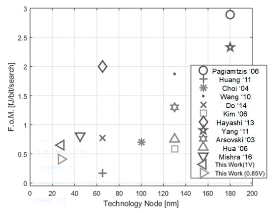 Finally, the overall performance of this memory prototype has been compared with the state-of-the-art of the associative memories available in the literature. More specifically, Table 2 reports the most important performance and Figure 11 shows the Figure-of-Merit (F.o.M.) vs. CMOS Technology node of this prototype and the literature [,,,,,,,,,,]. The adopted F.o.M. is given by Equation (9):