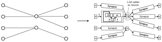 - Neuron: with k inputs comprises a k-input bit-serial adder to sum up the outputs of the k synapses connected to the neuron. We prepare neurons with various k. Adding a bias and evaluating the activation function is related to the function of biological neurons, so it may be natural for the neuron to have units for those functions. However, in our system, many neurons do not require those functions and we implement them in separate modules.