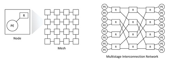 The topology defines the physical layout and the connections between nodes in the network. It impacts network performance and cost since the topology constrains the minimum number of hops a packet must perform to reach its destination. There are two main classes of topologies: direct and indirect. In the case of direct topologies, each node of the NoC consists of both a Processing Element (PE) and a router. Therefore, nodes are able to both perform computation and manage the communication towards other nodes. These topologies are called direct because each node has a direct (point-to-point) link to a subset of other nodes in the network; a mesh, as the one shown in Figure 1, is a classic example of direct topology. In the case of indirect topologies, computation and communication (packet routing) features are managed in separated nodes and, in particular, each computation node (PE) is connected to a switching node (or router) that enables the communication with other computation nodes. A classic example of indirect topology is Multi-stage Interconnect Networks (MINs) Figure 1.