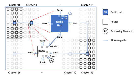 The considered RF-NoC architecture has a direct topology. It presents two levels of hierarchy covering the communication among cores (though a wired interconnect) and clusters (through an RF interconnect). Clusters are sets of cores providing another layer of hierarchy. In the considered architecture, 1024 cores are divided into 32 clusters, containing 32 cores. The communication within a cluster is handled through a 2D mesh wired NoC since the average path length is short compared to the global network. Figure 2 shows the wired links connecting cores within the cluster. Note that wired links between adjacent routers of separate clusters also exist. Moreover, each cluster contains a Radio Hub (RH) that attaches to it the four routers located in the cluster center. The RH is the component that leads to the second level of the hierarchy, i.e., the communications between clusters through the RF waveguide. Thus, each cluster features an RF-NoC Interface, located at its center, to access the waveguide. It is connected on one side to the four central routers, as illustrated in Figure 2, and on the other side to the RF waveguide.