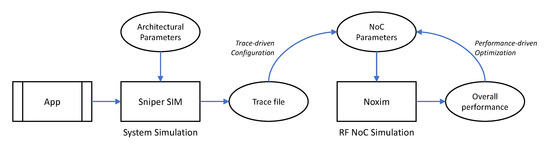 In this section, we detail the proposed framework, depicted in Figure 4, which is specific for the performance evaluation of RF-NoC architectures. This framework is based on the combination of two existing simulators: Sniper and Noxim. We selected Noxim as in its released version it already supports wireless communications thus its extension to RF-NoCs allows us to have in the same framework the availability of three different NoC architectures, namely, traditional wired NoC, heterogeneous wired WiNoC, and heterogeneous wired RF-NoC. In addition, to obtain the communication patterns generated by an application, it needs executing the application on a multi-core simulator and tracing all the communication flows induced during the execution of the application. To this end, we used Sniper.