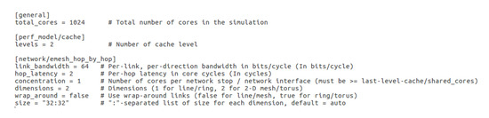 The major exploited benefits offered by Sniper are the integrated benchmarks that enable fast tests with common tasks, the possibility to write custom test applications, and the full details of the interconnection network, core models, and cache. Sniper was thus used to model our NoC topology and to obtain communication traces from real application benchmarks. Sniper includes several folders that provide built-in tools and configuration files for the simulation parameters. The main folders used in our framework are: config which contains the NoC configuration file that describes the network to be simulated. Figure 5 gives an example of NoC configuration specifying the number of cores, memory cache levels, network topology, cores concentration, and bandwidth in bit per cycle; Benchmarks, which contains various benchmarks such as those from SPLASH-2, PARSEC, and SPEC CPU®2006 sets. test in which a set of applications to evaluate the network such are collected. The initial set of applications come from Sniper (e.g., FFT) but it is possible to add the custom applications to test; Finally tools folder includes python-coded tools to analyze simulation results.