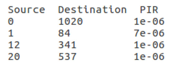 From these statistics, the total number of communication occurring inside the RF-NoC is easily derived. The python script, proposed for PIR’s evaluation, is then able to generate the traffic table. This traffic table is a text file in which each line represents the communication between a source and a destination and their associated PIR. Figure 6 shows an example of a few lines of the generated traffic table. This format of the traffic table is supported by the Noxim simulator. From the user point of view, all the previous steps are automatically done by the framework.