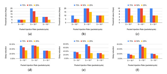 Figure 7 reports threshold values for , and RF-NoC architectures under the three different traffic scenarios, with their respective delay reductions. We choose three different packet injection rate values to study the evolution of the threshold and the delay reduction value under different traffic loads. In these results, the total number of communications is , which is similar for the real application traffic generated from Sniper and the synthetic ones, and all communications have the same packet injection rate. This total number of communications remains constant to have a consistent comparison. The reported threshold for different PIR values and different topologies in the following results refers to the appropriate threshold to reach the maximum network delay reduction.