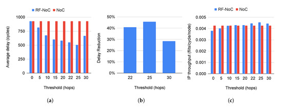 Figure 8a shows the average delay of both wired NoC and RF-NoC for different threshold values. We notice a high latency when the threshold is between zero and five hops, which reflect the overuse of the RF link. The RF utilization is about 85%, with a threshold value of zero. It means that most of the packets are routed towards the radio hubs, which leads to network congestion. However, the latency gets reduced in a significant way when the threshold increases until it reaches the value of 25 hops. This threshold value leads to a delay reduction of 45%, as shown in the graph depicted in Figure 8b, which confirms the importance of the choice of the threshold to attend a maximum delay reduction. Once the threshold is greater than 25 hops, the average delay increases again.