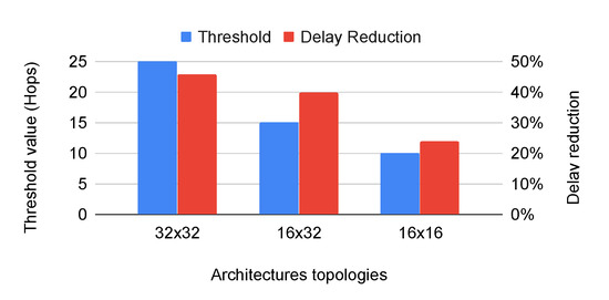 The same steps were applied for and topologies and Figure 9 shows the threshold value evolution and the maximum reached delay reduction. We notice that the threshold value and the delay reduction increases along with the network size for the considered application. From Figure 9 we can conclude that for Splash2-FFT, in a topology, and 25 hops as threshold form the best combination leading for the highest network latency reduction, as illustrated in Figure 8b showing the importance of the threshold selection.