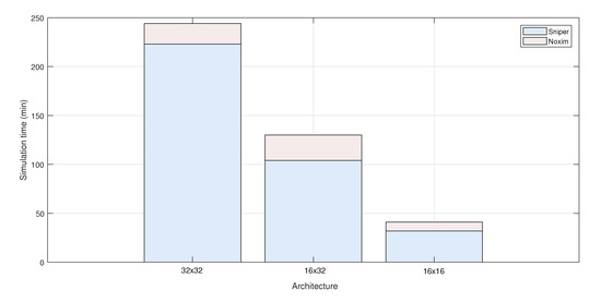An important feature of a design exploration framework is the simulation time. Figure 10 represents the simulation times when simulating Splash2-FFT benchmark for the 3 considered topologies i.e., 32 × 32, 16 × 32 and 16 × 16 using the framework. All simulations were done on a DELL Latitude 5580 computer, with Intel core i7 processor, 16 Gb RAM, running ubuntu 16.04 LTS. The simulation time of Sniper depends on the benchmark, whereas the simulation time of Noxim depends on the number of clock cycles we want to simulate. In this example, we set the simulation time to 10k clock cycles in Noxim. That is, actual communication flows simulated by Sniper are replaced with statistical communication flows in Noxim. According to Figure 10, we observe that the simulation times increase along with the benchmark complexity. Thus, the fraction of simulation time of Sniper dominates the total simulation time. Even if we change Noxim’s input parameters (threshold value, RF bandwidth, modulation order, etc.) the results may remain roughly the same.