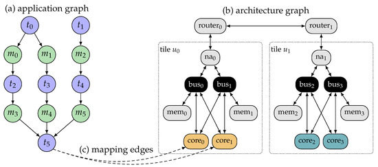 Most approaches for design automation require a formal system model which serves as a basis for the optimization and verification processes performed throughout the DSE. The design problem of heterogeneous embedded systems, including the many-core application mapping problem, is typically represented using a graph-based system model, referred to as a specification which consists of (i) an application graph representing the application, (ii) an architecture graph representing the target many-core platform architecture and (iii) a set of mapping edges which connect these two graphs to reflect the task-to-core assignment options, see References [15,21]. This section provides an overview of the application and architecture models commonly used in the embedded many-core domain and demonstrates how these models can be converted into the graph-based specification.