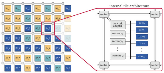 Example of a heterogeneous tiled many-core architecture. Tiles are interconnected by a 2D mesh Network-on-Chip (NoC). Each tile consists of a set of processing cores, a set of memories, and a Network Adapter (NA), interconnected via one or more (memory) buses. Different tiles may contain different types of cores, here denoted by color.