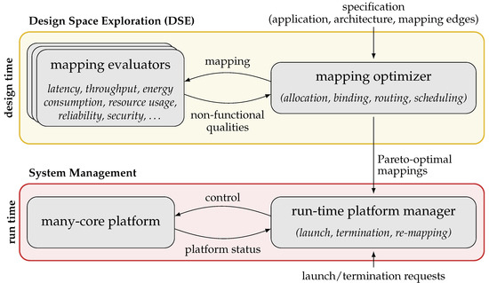 - Wildermann, S.; Weichslgartner, A.; Teich, J. Design methodology and run-time management for predictable many-core systems. In Proceedings of the IEEE International Symposium on Object/Component/Service-Oriented Real-Time Distributed Computing Workshops, Auckland, New Zealand, 13–17 April 2015; pp. 103–110. [Google Scholar]