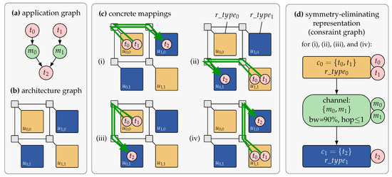 Illustration of application mapping and architectural symmetries, adopted from Reference [45]. The specification consists of (a) an application graph and (b) an architecture graph. (c) A design-time DSE explores mappings. Shown are four different concrete mappings for the three tasks , , and of the application onto the architecture containing four tiles , , , and where tile types are distinguished by color. (d) Each mapping is transformed into an intermediate representation called constraint graph [41]. The constraint graph encodes rules for the RPM on how to feasibly embed the application. As depicted, the resulting constraint graph is identical for all four concrete mappings in (c).