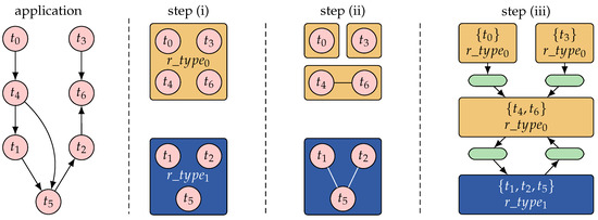 Symmetry-eliminating exploration consisting of three steps: (i) mapping tasks to resource types, (ii) clustering of tasks, and (iii) construction of constraint graph. For the sake of clarity, messages are not shown in the application. The example is adopted from Reference [45].