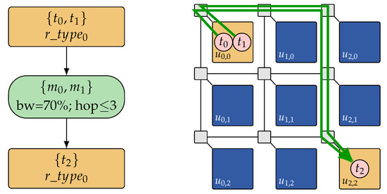 Figure 4 presents an example where an application consisting of tasks , , and should be mapped onto an architecture containing four tiles , , , and . A classical task-to-resource application mapping results in mapping combinations. Figure 4c illustrates four different concrete mappings. In each mapping, tasks and are mapped to a resource of type while is mapped to a resource of type . The mappings differ from each other in their choice of resource instances. However, all four mappings are identical in terms of the number of allocated resources (one instance of resource type and one of ), the assignment of tasks to the allocated resource types, and the hop distance, direction, and allocated bandwidth for the messages exchanged between tasks and . This is indicated in the abstract representation in Figure 4d which is referred to as a constraint graph.