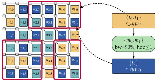 Embedding a constraint graph in a given architecture requires (i) binding of task clusters to resources and (ii) routing of messages between them on the NoC. Predictable application execution is only possible when embedding follows the resource reservation configuration of the constraint graph. This basically means that sufficient computation resources have to be provided to bind all task clusters as well as sufficient bandwidth on communication resources to route all message clusters with the maximum allowed hop distance. Selection of resources could be done by counting the required number of resources of each resource type and, then, selecting available resources on the architecture, that is, treating this problem as a knapsack problem as, for example, done by References [59,60,61]. However, these approaches neglect the routing of messages between the selected resources. Also, restricting the resource selection to resources which lie within a maximal hop distance (as, for example, done by Reference [46]) neglects constrained availability of shared resources as well as resource consumption.