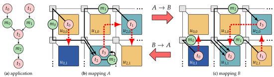 Dynamic mapping approaches offer a flexible and adaptive application mapping scheme that can be used for the design of systems with dynamic workload scenarios (use cases). In these approaches, mapping decisions are conducted online at the time an application must be launched, see, for example, References [26,39,40]. In spite of their flexibility, the processing power available for the online decision processes is limited to the resources of the underlying platform, and the time for their decision making is restricted by application-specific deadlines. Therefore, dynamic approaches cannot afford compute-intensive techniques for their mapping decisions and, hence, typically yield application mappings of inferior quality, compared to static approaches.