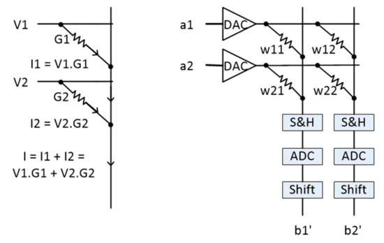 This is an example of matrix multiplication and crossbar 2 × 2.