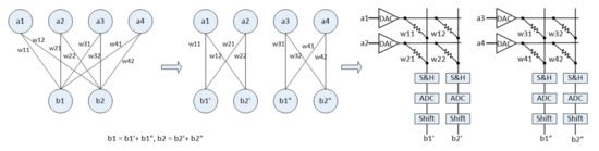 Since the size of the crossbar is fixed while the size of a neural network can vary and often become larger than the crossbar size, we have to decompose a neural network to smaller ones that can map onto crossbars. The most popular partitioning method used in literature is VDA, which is mentioned for the first time in Reference [16], but it was used in many previous works [6,7,8,10,11,12,13,14]. It is a simple and straightforward method, as an example in Figure 2. In this example, a NN 4 × 2 is decomposed into two 2 × 2 partitions. Their weight parameters are quantized in dynamic fixed-point format and mapped to two corresponding crossbar 2 × 2. Then outputs of these crossbars will be merged by an adder in PRIME [11] as a combined cost to restore the original outputs. However, before quantization, each number has its own scaling factor while, in VDA, all weight parameters in the same crossbar column share a scaling factor (implemented by a shifter). This reduces the accuracy substantially.