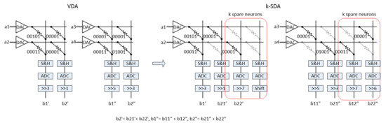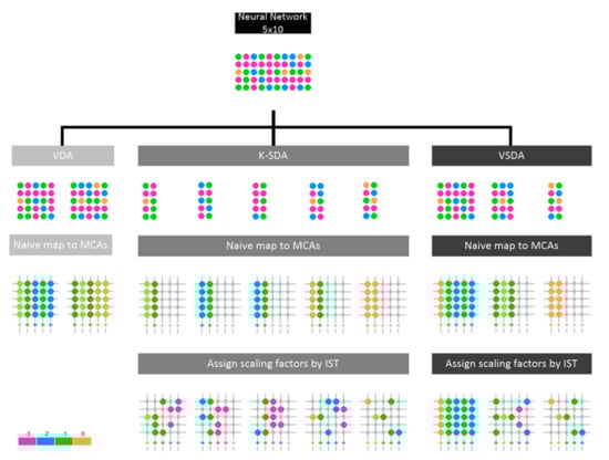 We show an example of VSDA in Figure 4. Because our main concern is scaling factors for convenience, we only represent their exponent values of all neurons in MCA. MCA is also represented in a simple form with shifters represented by colored plus signs. The scaling factor’s exponent values are represented by color dots with the value range in the color bar. A 5 × 10 NN is decomposed into two 5 × 5 NN partitions and mapped to two 5 × 5 MCAs in VDA. In k-SDA, it is decomposed to five 5 × 2 partitions and mapped to 5 × 5 MCAs for using 3-spare neurons for more three scaling factors. VSDA decomposed the original NN to three partitions of 5 × 5, 5 × 2, and 5 × 3 that correspond with their k values k = 0, 2, 3 of their spare neurons. Both weight parameters in k-SDA and VSDA are moved to their spare neuron by the IST algorithm. The neuron overhead of k-SDA is (5 − 2)/2 × 100% = 150%. VSDA’s neuron overhead is (3 − 2)/2 × 100% = 50%. We easily realize the improvement of VSDA compared to k-SDA.