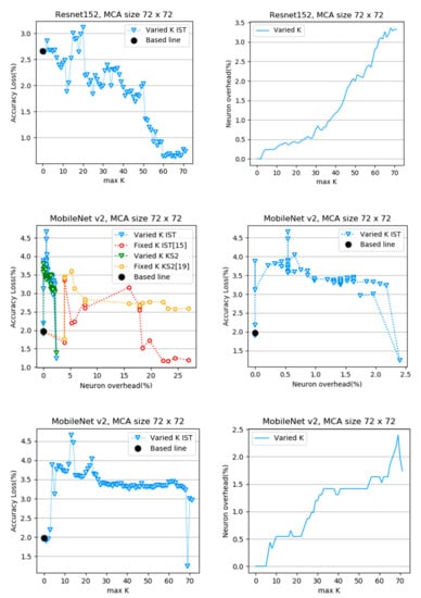 For the MCA size, we do experiments on crossbar size p = q = 72 firstly to compare our method with References [16,17]. The results are shown in Figure 5. Our algorithm gets better results in all cases including both varied k KS2 and IST. It keeps the state-of-the-art accuracy of models by using only 0.1%, 3.12%, and 2.4% neurons overhead for 0.44%, 0.63%, and 1.24% accuracy lost in VGG16, Resnet152, and MobileNet v2, respectively, which is compared to 10–20% neuronal overhead in other methods. The result also shows the changing of the neuron overhead and accuracy lost by max_k. In Reference [17], the authors concluded that KS2 is better than IST based on only a small range of k experiments. Our experiments with a larger range of max_k demonstrate IST is better than KS2.