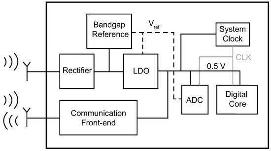 With recent advances in System-on-Chip (SoC) architecture in the context of Internet-of-Things (IoT) devices, a need for autonomous devices that can be powered by harvesting the energy from outside sources has arisen [1]. One possibility is to use the query signal as the power source, such as in Ultra-High-Frequency Radio Frequency Identification (UHF-RFID). For these autonomous devices to work with such a low amount of available power, they need highly efficient power management. A key component of such SoC-IoT applications is the Low Drop-Out regulator (LDO). LDOs are DC voltage regulators that regulate the output voltage even when it is close to supply output voltage, which is the case in sub-1 V general IoT [2,3] and passive radio communication systems. In such a system as seen in Figure 1, the power efficiency is maximized with the minimization of the drop-out voltage which is defined as the difference from the rectified voltage to the power line voltage. Conventional Digital-LDO architectures (D-LDO) show-off drop-out voltage as low as 50 at 0.5 regulation voltage that offers a significant advantage compared to analog-LDOs [4] that are incapable of supporting comparable drop-out voltage in ultra-low-power and ultra-low-voltage specifications. In combination with state-of-the-art bandgap voltage references [5,6,7,8] that operate down to 0.5 V opens-up the perspective of operating the system at sub-1 V voltage with high efficiency.