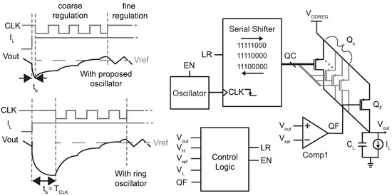 With the purpose to meet the SoC-IoT specifications as described, the proposed D-LDO is designed with fine regulation performed in asynchronous scheme, and synchronous coarse regulation assisted with burst-operated oscillator. Commonly used cold start-up operation of a ring-oscillator relies on charging and discharging of consecutive delay stages [16], thus the burst-clock response naturally depends on the oscillator frequency () as illustrated in Figure 2. In contrast, the presented oscillator is based on a multi-vibrator design assisted by a latched comparator accompanied by an appropriate wake-up circuit which triggers the serial shifter with delay independent of the oscillator frequency. As shown in Figure 2, with the purpose to perform load regulation, the system incorporates the control logic block that controls the current state which is alternated between fine and coarse regulation in case of load surge. The control logic unit produces the EN and LR signals that control the ignition of the oscillator and the direction of serial shifter respectively in the case of coarse regulation, while Comp 1 comparator regulates the load with delay hysteresis under fine regulation. pMOS devices correspond to coarse regulation while pMOS device to fine regulation as operated from Comp 1 comparator.