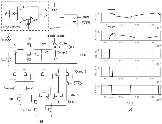 As previously stated, in comparison with current-starved ring-oscillators, a multi-vibrator provided with a latch comparator offers a higher gain with fewer stages consequently, the wake-up process becomes faster. Figure 3a illustrates the oscillator unit that provides the burst-clock generation. While signal EN is set to low, as seen in Figure 3b, at fine regulation, the capacitance is decoupled from the multiplexer. With the purpose to minimize the charge injection into the capacitor a transmission gate is used that holds the signal steady. Meanwhile, the output of the latched comparator Comp 2 is set to low. As EN is pulled up by the control logic when it detects either over-voltage or voltage droop, an edge detector detects the falling edge of the signal and sets the CHRG signal low. The latched comparator is equipped with a branch that sources current to one side of the latch connected to nMOS device and another that drains current from the other side connected to nMOS device , thus the wake-up procedure triggers the latch differentially. As the voltage at the gates of and varies inversely proportional and surpasses differentially the threshold set by certain latch sizing [17], the output OUTA is charged. When the circuitry is latched, the negative edge of CLK output is triggered as well. As the multiplexer selects the current sink, decreases, and the capacitance starts to discharge which means that the oscillations begin. The CHRG signal remains low until the propagation delay of signal set it to high. Therefore, the CHRG signal remains low for a time span irrelevant to the oscillation period. Consequently, burst oscillation responds within time under load current surge that is independent of the oscillator frequency. The oscillation period is defined predominately by the Comp 2 hysteresis levels and , capacitance and parameter as seen in Equation (1).