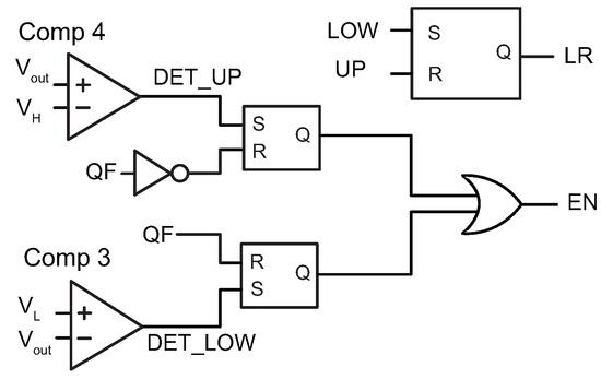 The block diagram of the control logic is illustrated at Figure 4. The comparators Comp 3 and Comp 4 as shown are controlled by voltages and respectively, that define the droop and over-voltage detection thresholds. Each comparator Comp 3 and Comp 4 feeds Set-Reset latches with the signals DET_LOW and DET_UP respectively, and pull up each of them in case of a triggering event. Comparator Comp 1, which is responsible for the hysteretic fine regulation of the output, resets the latches that correspond to Comp 3 and Comp 4 when the coarse regulation converges after a droop or over-voltage recovery. The OR-Gate pulls up the EN signal in case of a droop or over-voltage while EN remains pulled down during fine regulation. The shifting direction is determined through the output of an additional SR latch that is set with the DET_LOW signal and is reset by DET_UP signal. Comp 1 has been implemented as a four-stage comparator that incorporates a differential pair, latch, preamplifier, and a push-pull final stage while Comp 3 and Comp 4 are realized via two-stage latch-based comparators.