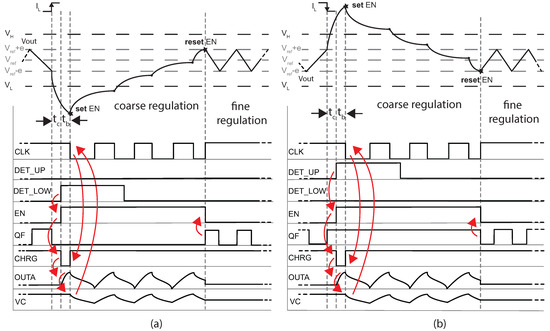 Figure 5 illustrates the detailed timing diagram alongside with the system response under voltage droop and over-voltage. As droop happens in Figure 5a, EN signal is set by DET_LOW and coarse regulation is ignited with CLK negative edge after the delay that depends on the comparator Comp 3 and oscillator start-up delay, and respectively. As seen, after the comparator delay the EN signal is set and output of the comparator Comp2 (OUTA) is charged. As the comparator output surpasses the inverter trip point, the CLK signal is dropped and the oscillations begin soon after where the oscillator wake-up time interval () ends. The CHRG is reset to high state as the clock signal CLK is dropped to LOW. As the clock generation begins, the shift register activates each bit successively and the voltage droop is tamed. When the voltage level is reached, where e is the offset from the reference of the output voltage due to comparison delay, the latch connected to Comp 3 is reset by signal and EN signal is set to low. Since the DET_UP remains low and is low as well, the upper SR latch remains in the previous reset state. That ceases the coarse regulation and fine regulation takes place with ripple magnitude defined merely by the comparison delay of the comparator Comp 3. A similar operation is performed in case of over-voltage as seen in Figure 5b.