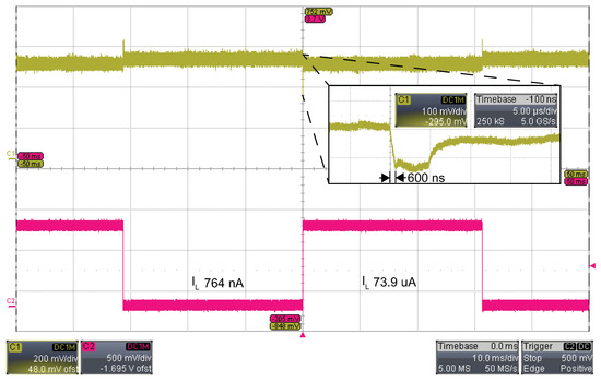 With and , the quiescent current was measured and it varies from 558 to 621 for load current of 764 to 73.9 . To elaborate more, the off-state quiescent current of the oscillator consumes 8% of the total minimum quiescent current, Comp 3 and Comp 4 50%, Comp 1 27% while the remaining 15% is distributed to the voltage divider, power-on-reset circuit, current distribution circuitry, and leakage current of the control circuitry. The reference of output regulation voltage is fixed at 0.5 V during measurements such that maximum power efficiency is achieved for given drop-out voltage and load current. Figure 8 illustrates the steady-state measurements of the current efficiency and voltage regulation. As illustrated, the maximum load regulation comes at 528 / and maximum line regulation of 120 mV/V was observed. As seen at Figure 9, for current load more than 15.9 , the minimum measured efficiency is 96.2% while the maximum value reaches 99.2%. The maximum value of power efficiency is 88.5%, which is higher than 76% as reported for SoC-IoT-oriented analog LDO [4]. Hybrid implementation of the regulator as presented in [12] combines inductor-based switching regulator with D-LDO and naturally shows off higher power efficiency of 94%. However, higher efficiency comes at the expense of higher power consumption of 30.5 total system quiescent current.