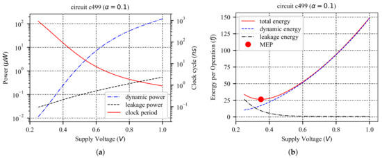 MEP exploration for circuit c499 from ISCAS’85 benchmark [37,38]. (a) Circuit power and clock period versus supply voltage (); (b) Minimum Energy Point (MEP). Minimum Energy Per operation is achieved where is close to .