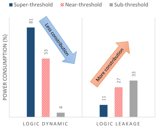 Power breakdown of the IA32 processor presented in [26] highlights a significant increase in the relative contribution of the leakage power of logic components to the total power consumption, when supply voltage is reduced towards near-threshold and sub-threshold regimes. The rest of the power consumption is due to the memory (8%, 20%, and 63% in the super-threshold, near-threshold, and sub-threshold region, respectively.)