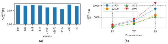 The average impact of process variation on of the benchmark circuits is displayed in Figure 3a. The shift in due to process variation is on average 66 mV for the benchmark circuits. This shift in may lead to significant performance variation and energy overheads. Moreover, the speed () of some circuits is also highly affected by process variation. Figure 3b demonstrates that of a circuit may change by about one order of magnitude when it is under different process variation impacts.