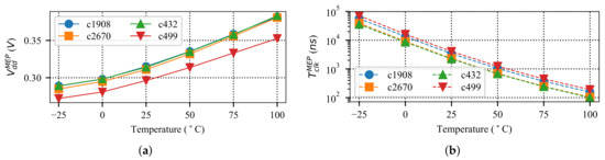 The impacts of process, supply voltage, and temperature variations (PVT) are more pronounced in the NTV region [27,33,44]. Authors of [45] showed that the sensitivity of the drain-source current of a transistor () to changes in and increases by about 10× when the supply voltage is reduced from the super-threshold region to the sub-threshold region. Equation (4) also demonstrates that propagation delay in the NTV region is exponentially dependent on supply and threshold voltages. Intel [33] reported that while the process and temperature variations cause 18% and 5% performance variation in the super-threshold region, their impacts aggravate to 2× performance variation in the NTV region.