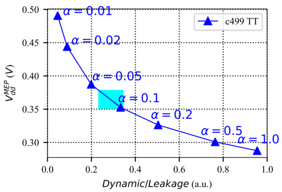 Figure 5 shows the change in for circuit c499 of ISCAS’85 benchmark due to a change in the internal switching activity. The x-axis of the figure represents the ratio of the dynamic energy to the leakage energy of the circuit (Dynamic/Leakage), when the circuit is operating at the nominal supply voltage (). The Dynamic/Leakage value has an inverse relation with as demonstrated in Figure 5. According to this figure, if the input switching activity changes from 0.01 to 0.1, the can vary from 0.49 V down to 0.35 V as Dynamic/Leakage increases. In a pure combinational circuit such as c499, the impact of workload variation could be very high as the dynamic power consumption is dependent on the input switching activity . However, in sequential circuits, a large portion of dynamic power consumption is related to the clock network. In such cases, variation due to fluctuation is typically less than in combinational circuits. Therefore, workload variation can also have a significant impact on energy efficiency, depending on the circuit architecture.