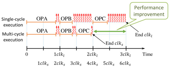 To save leakage energy, it is important to reduce the time a circuit is powered on but idle, i.e., the time a circuit is performing no operation. For this purpose, the timing slack under all operation conditions has to be trimmed. This is a very challenging task, in particular for functional units, which are fundamental components of data paths. In functional units, different operations have different timing criticalities and slacks. For instance, in an ALU, some operations need only a fraction of a clock cycle (e.g., logic operations), whereas others require a full clock cycle (e.g., addition operation with operands of long data type). Consequently, whenever an operation of the first category executed energy is “wasted” due to leakage, as the clock period is defined according to the slowest operation. Instead, it is much more efficient to execute operations of the second category at multiple cycles, which reduces the overall idle time of the functional unit, as conceptualized in Figure 6.
