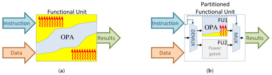 . (a) Executing instruction OPA on original functional unit and the associated leakage dissipation by unexercised components. (b) Executing instruction OPA on the partitioned functional unit and power-gating of smaller units.