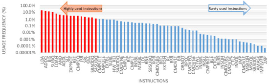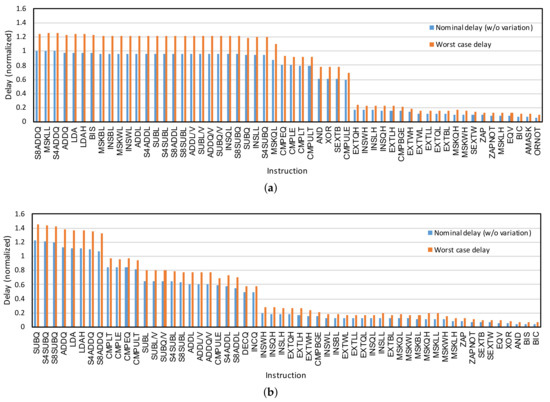 The propagation delay of functional units is typically dependent on input vectors. For example, in an ALU, the instructions can be categorized into slow instruction and fast instructions and the delay gap between fast and slow instructions might be significant. The logical operations such as inversion can be executed very fast while the execution of arithmetic operations such as addition and subtract requires more time. Figure 8a shows the normalized delay of various instructions of an ALU at 0.5 V (according to the simulation setup presented in Section 5). The synthesis tool balances as many paths as possible to optimize the energy given the timing constraints. In this case, 26 instructions are balanced to be critical or near-critical in terms of timing (slow instructions); however, the rest of the instructions require less time for completion (fast instructions).
