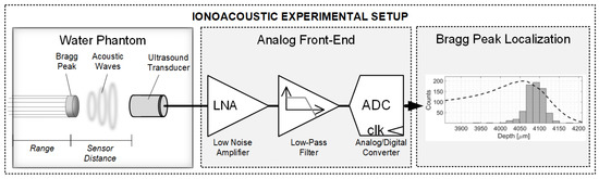 Ionoacoustic experimental setups are typically composed of a pulsed particle beam hitting a water phantom where the pressure signal is generated. Then, the pressure signal propagates in water and is sensed by a specific acoustic sensor (AS). The signal transduced into the voltage domain is then conditioned by an analog front end (AFE) and converted in the digital domain where the BP is localized with respect to the AS by measuring the acoustic wave time of flight (ToF). The scheme of a typical ionoacoustic experimental setup is illustrated in Figure 1.