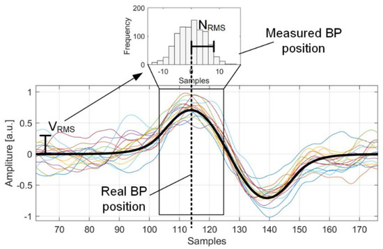 Conversely, in the case of correlated noise (low frequency noise), the adjacent samples will have a similar value (variation between one sample and the next, statistically less than 1 sigma), and the variation will be on a larger time scale. It is therefore easier to detect the true maximum point, improving the precision with the same SNR. This effect highlights the importance of proper analog filter sizing, which improves precision by both rejecting high frequency noise (improving SNR) and correlating noise, thus further improving precision. Again, the model results are in good agreement with [14], where a third-order Butterworth with RNBW = 2.5 was used.