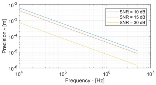 The ToF is then calculated with different noise realizations, and by evaluating the ToF variance, the measurement precision is estimated as shown in Figure 3. Then, the effect of three different parameters on measurement precision is evaluated. In particular, the three relevant parameters are signal frequency, SNR and noise shaping, defined as the ratio between the signal bandwidth and the noise bandwidth.