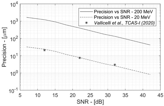 Figure 5 shows the relationship between precision and SNR for the two cases under review, 20 and 200 MeV. It is intuitive to think that at a high SNR, the achievable precision is greater, but having an analytical tool to quantify this ratio is essential to extract the SNR specifications to design a detector that achieves the desired precision. According to Figure 4, the precision at 20 MeV is higher than that at 200 MeV due to the different frequency of the signal.