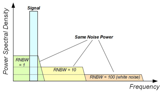 To separate the effect of the SNR and noise frequency shaping, we introduce the relative noise bandwidth (RNBW), defined as the ratio between the noise bandwidth BWnoise and the signal frequency.