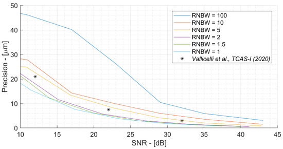 The reduction of the RNBW allows one to obtain the same precision (for example, of 0.5 mm in the bottom of Figure 11) with an 8 dB lower SNR.